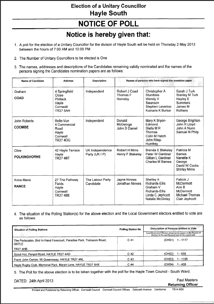 (You can inspect paper copies of the Notices of Poll and Notices of Election Agents at our offices in Liskeard and Camborne. The address for each office is on the right had side of this page.)