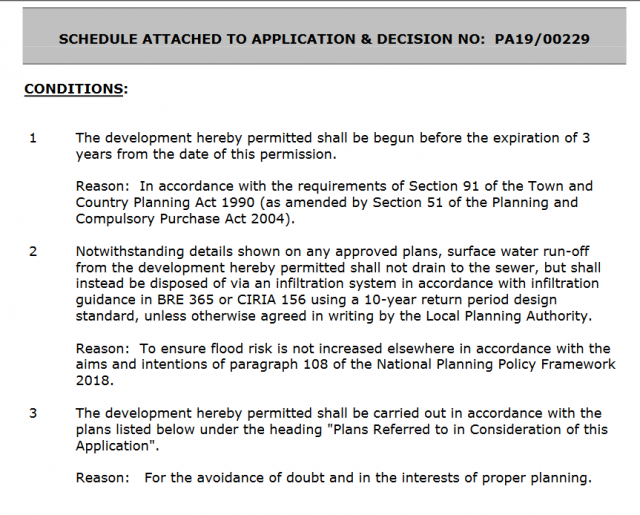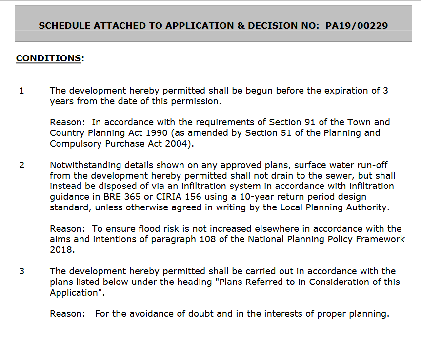 Reason: In accordance with the requirements of Section 91 of the Town and Country Planning Act 1990 (as amended by Section 51 of the Planning and Compulsory Purchase Act 2004). - Notwithstanding details shown on any approved plans, surface water run-off from the development hereby permitted shall not drain to the sewer, but shall instead be disposed of via an infiltration system in accordance with infiltration guidance in BRE 365 or CIRIA 156 using a 10-year return period design standard, unless otherwise agreed in writing by the Local Planning Authority.