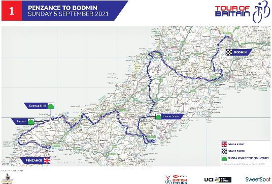 A map showing the route for the first stage of the Tour of Britain in Cornwall