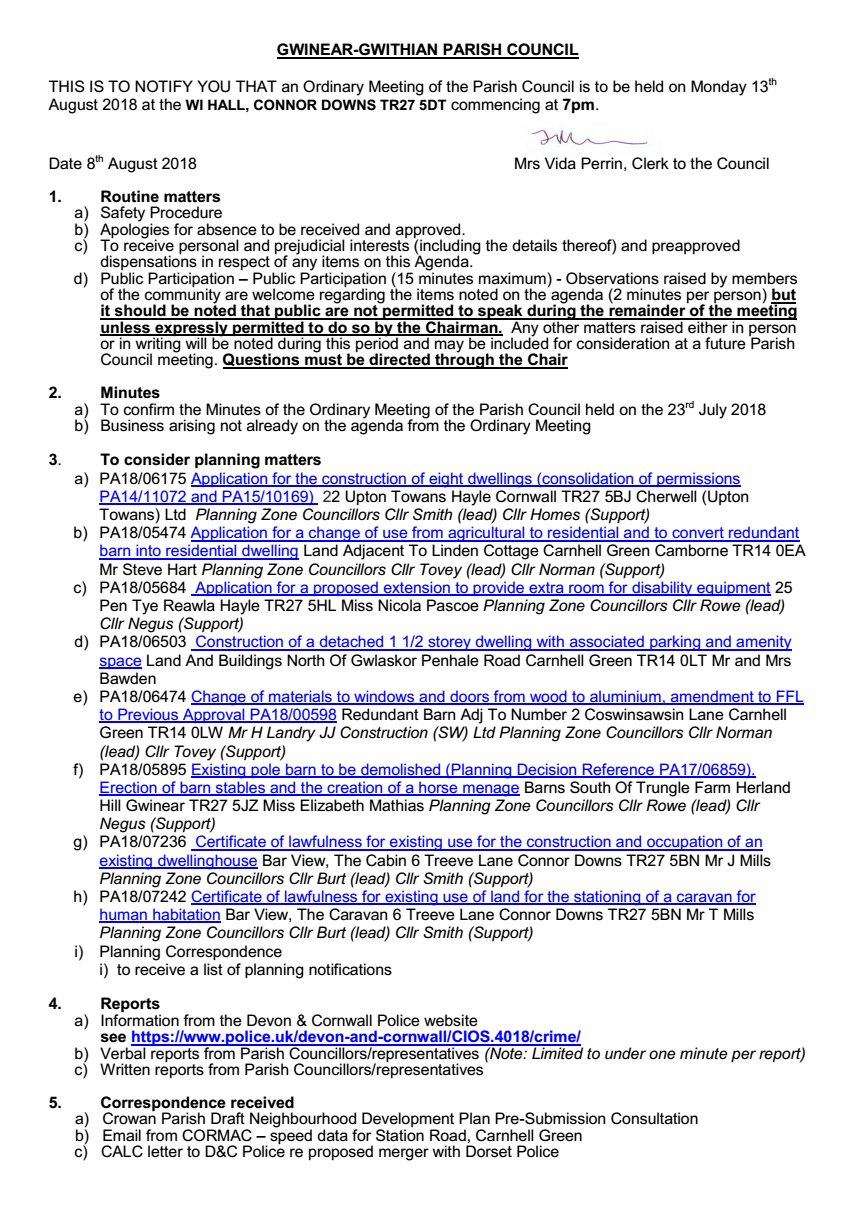 180808 | Agenda for Parish Council Ordinary Meeting – 13th August 2018