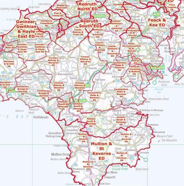 The proposed new council divisions in the Falmouth and Helston area, which will be discussed by Cornwall Council next week