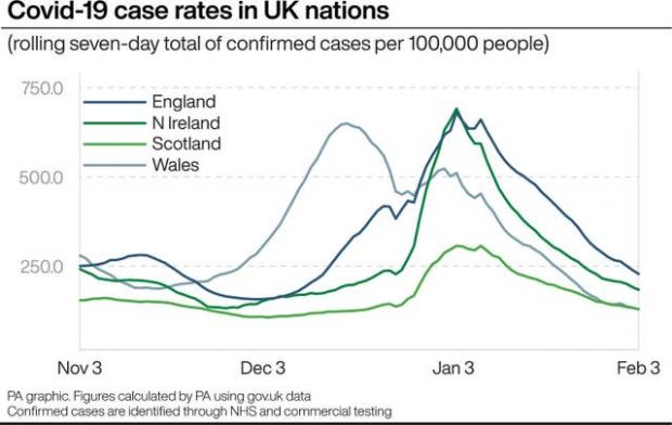 Covid-19 case rates in UK nations. (PA Graphics)